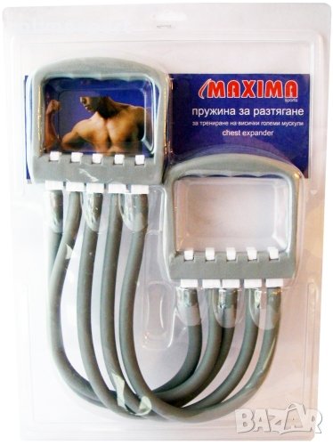 Експандер гумен MAX, С 5 ластика. Съпротивлението може да се регулира чрез премахване и добавяне на ластици. Подходящ за трениране на различни групи мускули в горната част на тялото - гърди, рамене, ръце, гръб. Дължина с неразпънати ластици – 59 см. Дължина отсег за хващане – 9.5 см. Материал – PVC, каучук. Цвят – сив. Тегло нето – 300 г. Тегло бруто – 420 г. Размери опаковка – 38х29х5 см.
