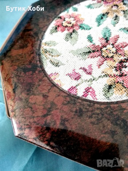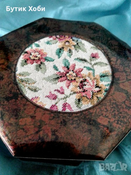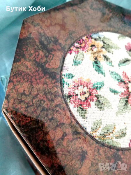 Старинна австрийска кутия за бижутата с гобленов декор. Рядко срещан екземпляр в перфектно състояние! Изработена е от материал подобен на плътна мушама. Маркирана. Размер - 12х12х5см.