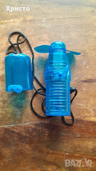 Цвят прозрачно син с връзка за носене на врат, дължина в прибран вид 11 см, диаметър ф 2,5/3 см, работи с 2 батерии 1,5 волта, клас АА, които не са включени в цената, дължина на връзката са врат общо 84 см обиколка. В зависимост от поставянето на батериите, може да духа от едната или от другата страна, като ги поставяте в 2 различни посоки винаги.
