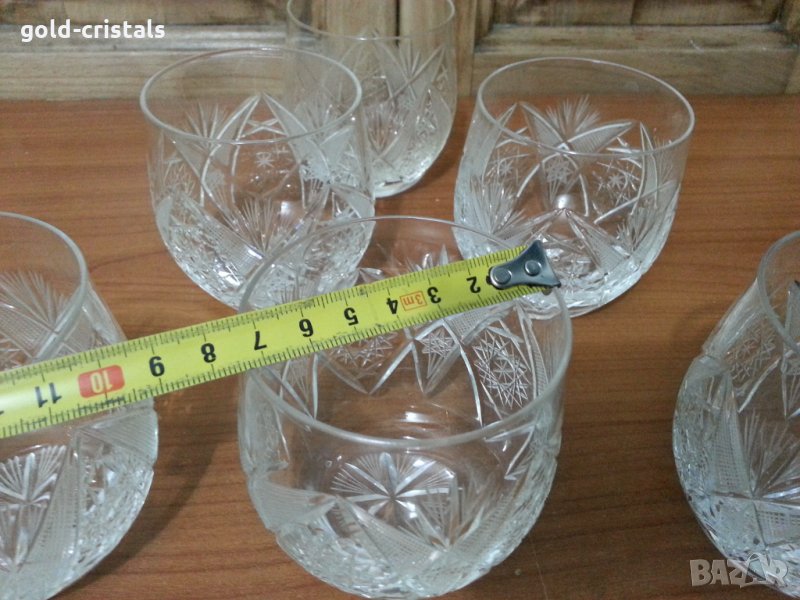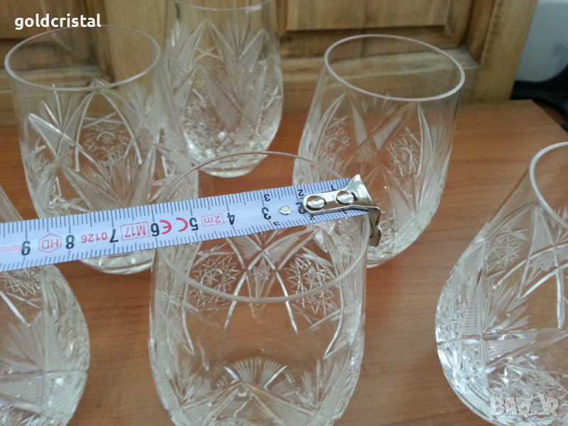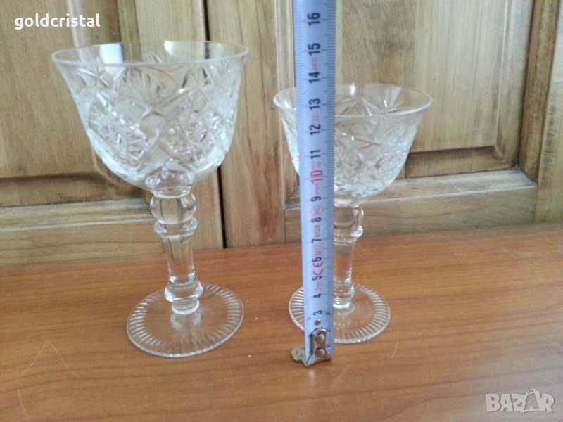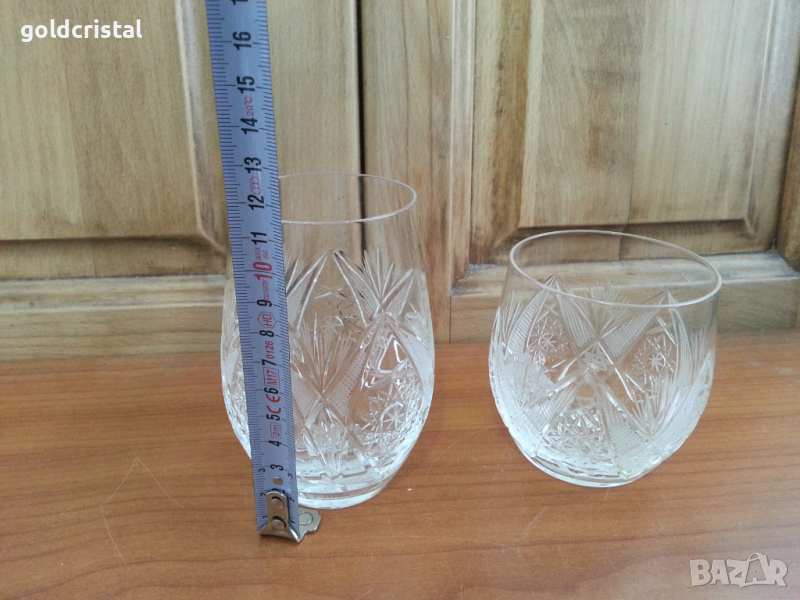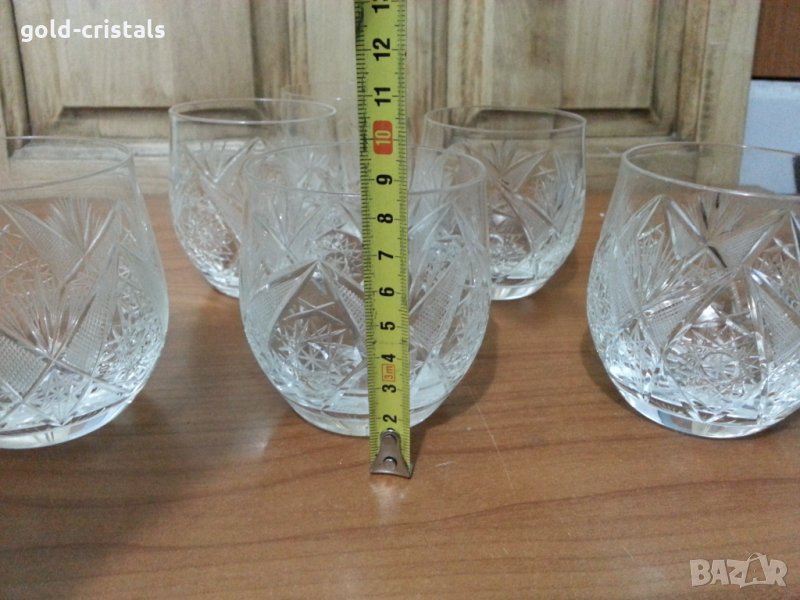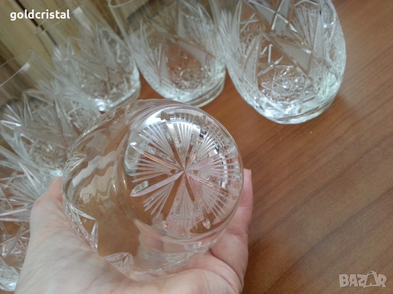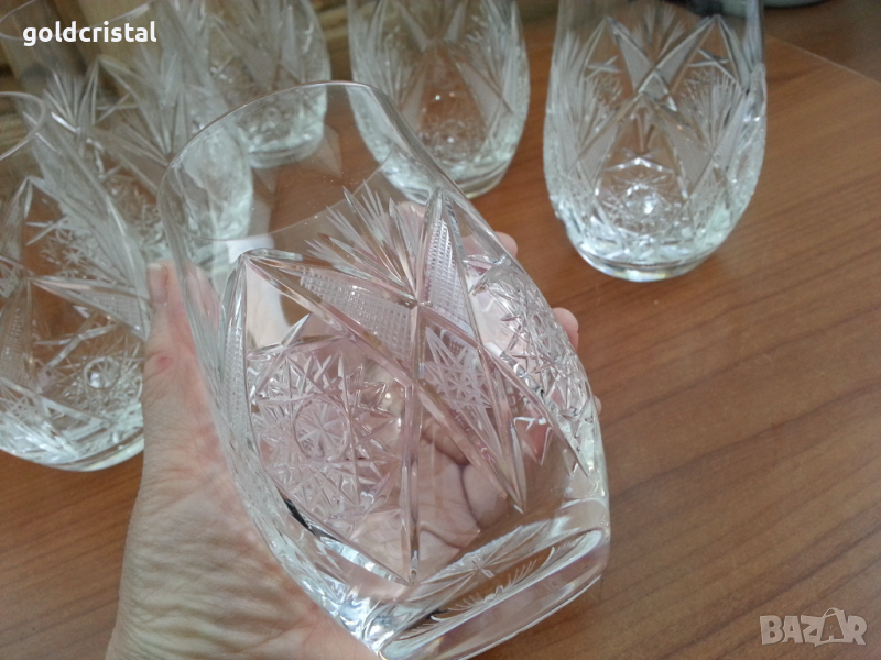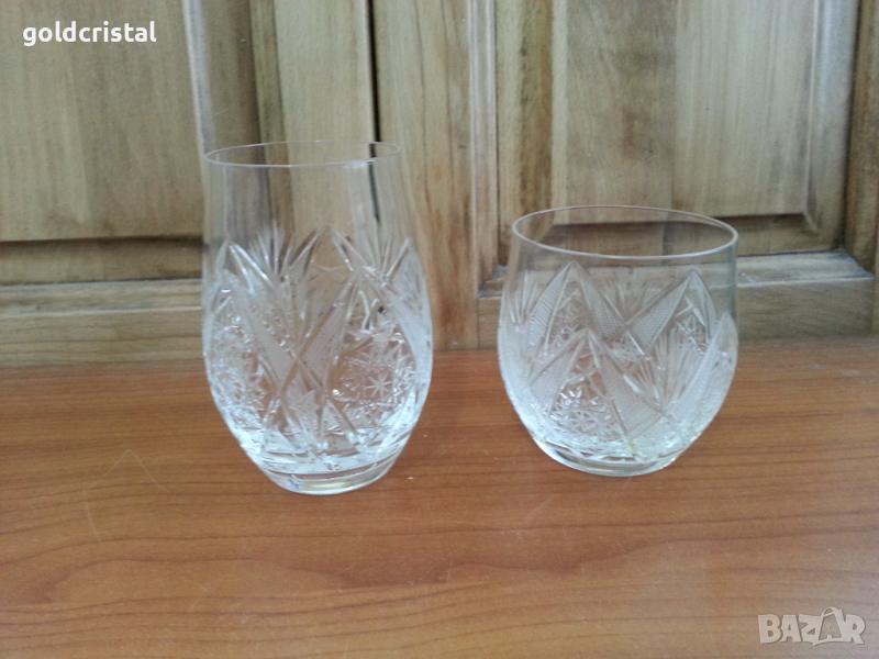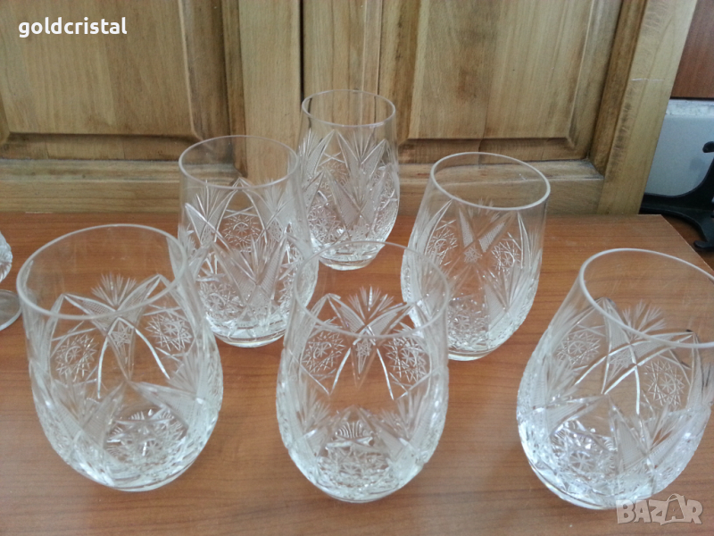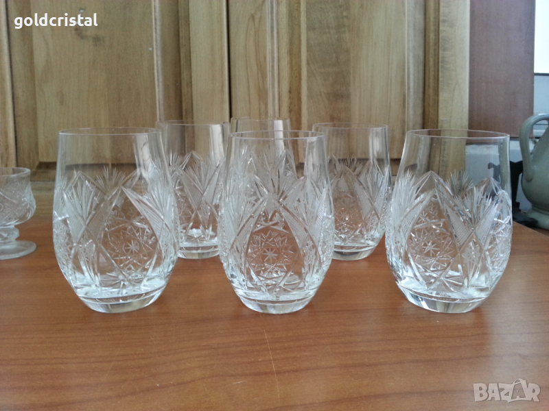 Кристални чаши серия Галя за уиски 6 бр 460лв за вода 480лв за вино 6 бр 480лв за ракия 6 бр 360лв стар български кристал ръчно гравирани богата гравюра неизползвани сервиз комплект сет лот ретро арт декор винтидж стил колекция старинни антикварни предмети обзавеждане за дома и семейството подходящи за подарък за ценители и колекционери