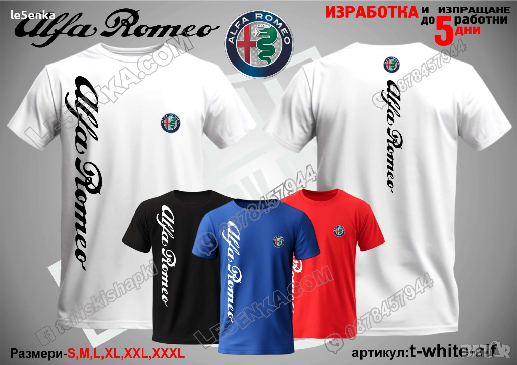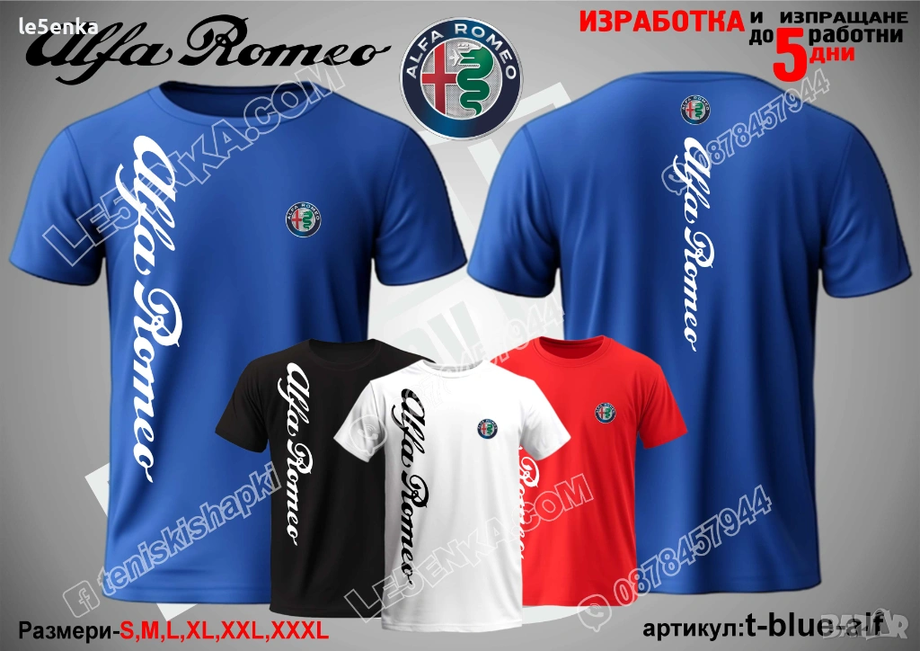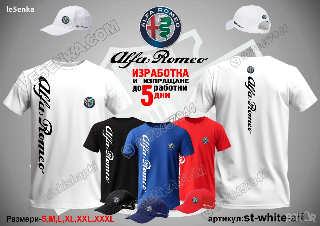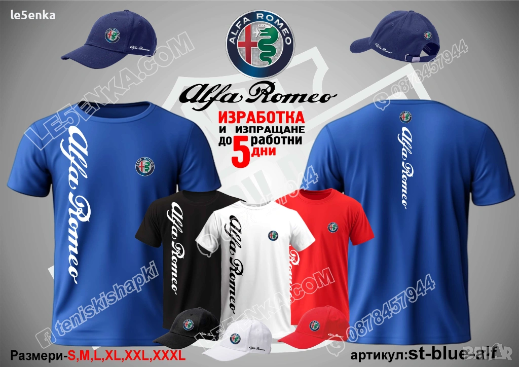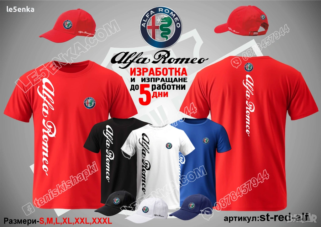 Посочената цена е за шапка и тениска комплект. Само шапка - 18 лв. ,а само тениска - 32 лв. Тениските са изработени от качествена памучна материя - различна номерация и цветове - черен, син, червен и бял. Шапките са памучни с метален клипс или коланче за регулиране - тип бейсболни. Последната снимка в обявата е на таблица с размери за тениските.