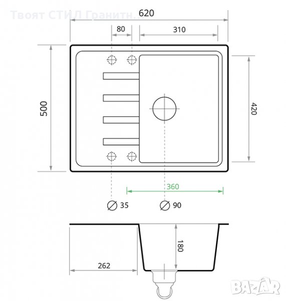 Размери : Ширина: 620мм, Дължина: 500мм Дълбочина на коритото: 180мм