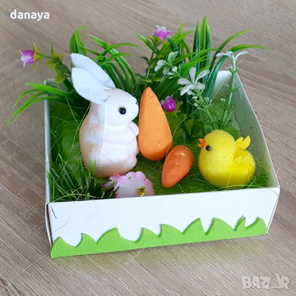 Мини декорация за Великден в картонена кутийка. Великденско зайче с два моркова и пиленце в градинка, красиво декорирани с високи тревички и цветя от PVC. Красива украса за Великден.