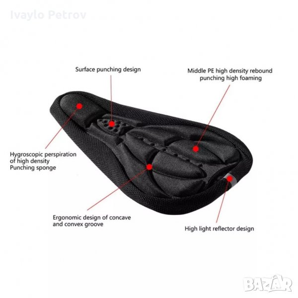 Калъф за седалка за колело, с гел в средната си част, който омекотява оригиналната седалка на колелото и ви позволява дълги преходи без да се натъртвате. Калъфа има връзки, с които го пристягате към седалката на колелото и светлоотразителен кант отзад. Долната част, която се закрепя към седалката е снабдена с малки шипчета, против приплъзване.