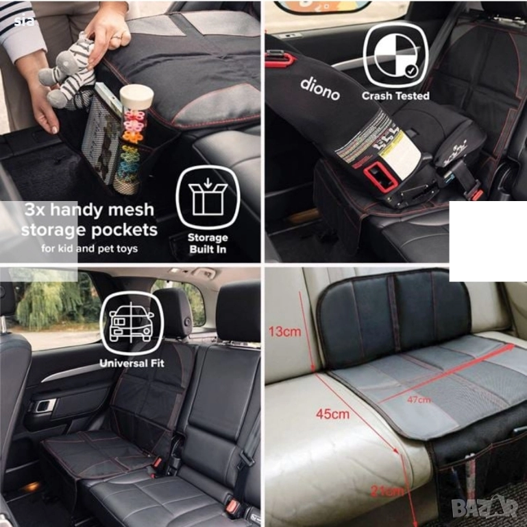 Защитно покритие от водоустойчива материя, с подложка, предпазваща от плъзгане и стабилна армировка за допълнителна защита. Прилепя се лесно и здраво на седалката, а подсилените му ъгли осигуряват безопасност. Разполага с 3 джоба с мрежа в долната част за лесна подредба и съхранение на дребни принадлежности, необходими за разходката с детето. Поставете го под детската седалка, за да предпазите автомобила от повреди и замърсяване. Подходящ е за използване под детски седалки. Съвместим е с повечето седалките за автомобил. Почистете повърхността с влажна кърпа.