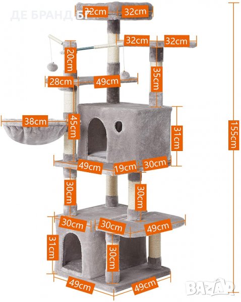 с две хралупи за дрямка, един хамак, едно легло, платформи за катерене и лежане