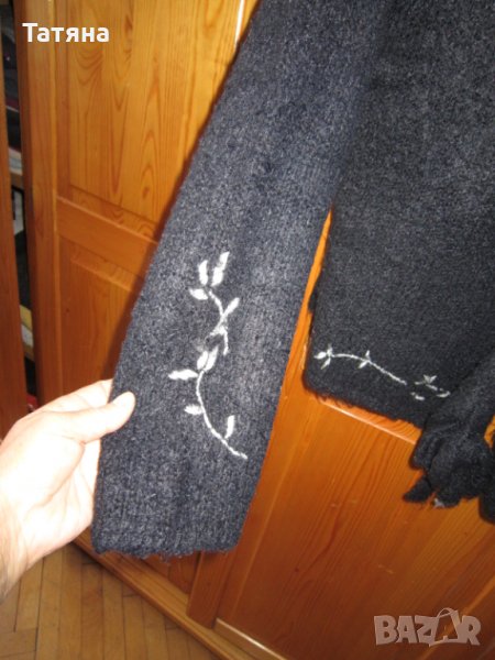 Снимка 10-13 Черна жилетка с красиви с ръчно бродирани 770;80;58/ орнаменти,ВЪЛНА И ПОЛИЕСТЕР.Преждата е от вълнено букле и е много мека на допир и много топли.Цена - 20 € ;Триъгълния завършек -на снимка13 много добре прикрива коремчета и по-заоблени фигури