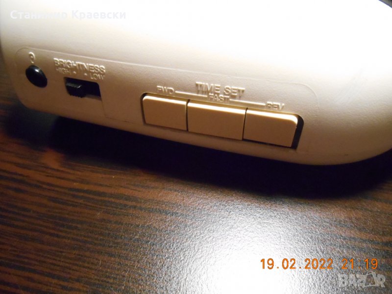 Запазен външен вид Радио часовник и аларма работят Не работят 2 та бутона за сверяване на часовника - бълзо - назад На пред бутона работи и може да се сверява но малко бавно но става Други забележки няма по работата му Скалата има осветление но е слабо поне за мен