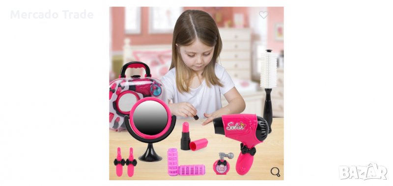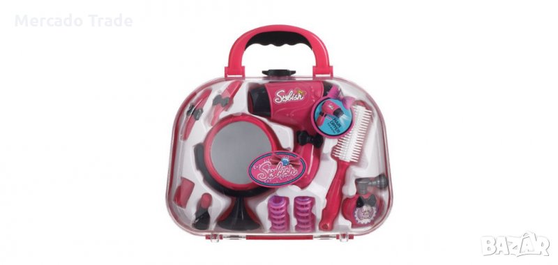 Розово куфарче с реалистични фризьорски и козметични артикули. Съдържа сешоар, четка, огледало, валяк за коса, пинсети, червило и парфюм. В чантата можете да съхранявате играчките, за да ги имате винаги със себе си.