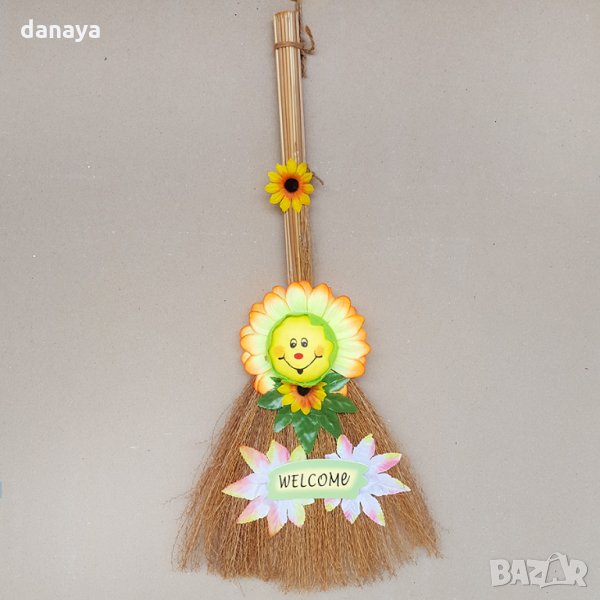 Декоративна метличка с декорация слънце за окачване. Великденска декорация украса за стена, врата или на всяко друго място, където може да се закачи. Метличка с усмихнато слънце отпред и надпис Welcome. Предлага се в два модела. Изработени от естествени материали и плат.