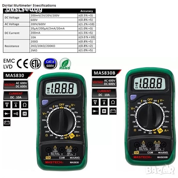 Дигитален мултицет MAS830L е многофункционален и компактен измервателен уред, който има възможност да измерва различни ел. величини: постоянно и променливо напрежение, постоянен ток, съпротивление, максимално показание 200, измерване диод, звукова индикация