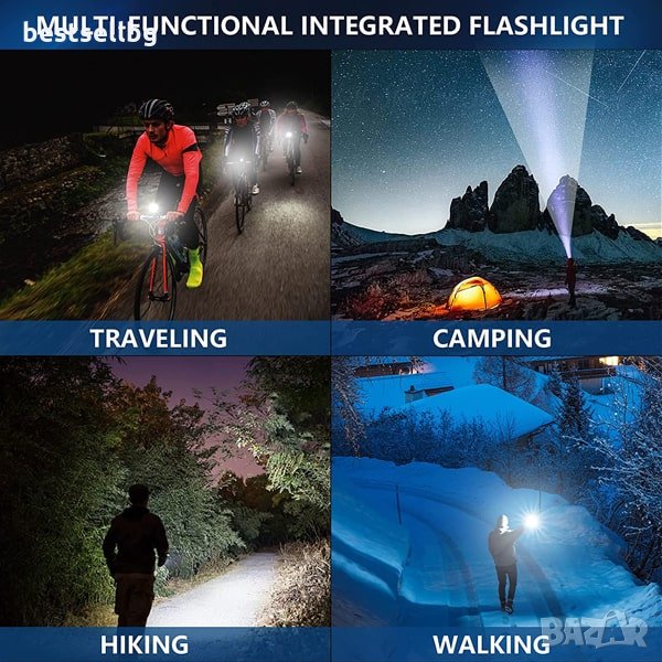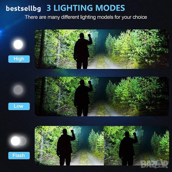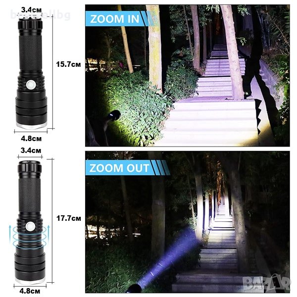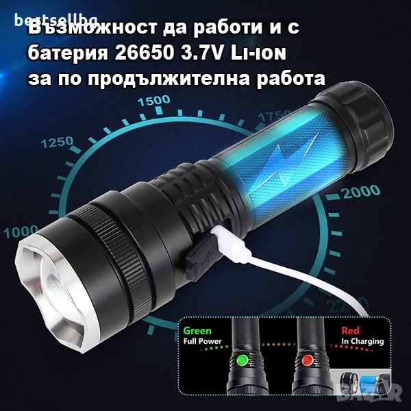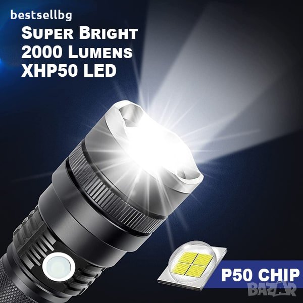 Тактически фенер XHP50 CREE с 3000 лумена, с телескопичен фокус, 3 режима на светене и авариен режим, възможност да работи с няколко модела батерии 18650 или 26650 3.7V Li-ion и батерии ААА и USB зареждане през фенера