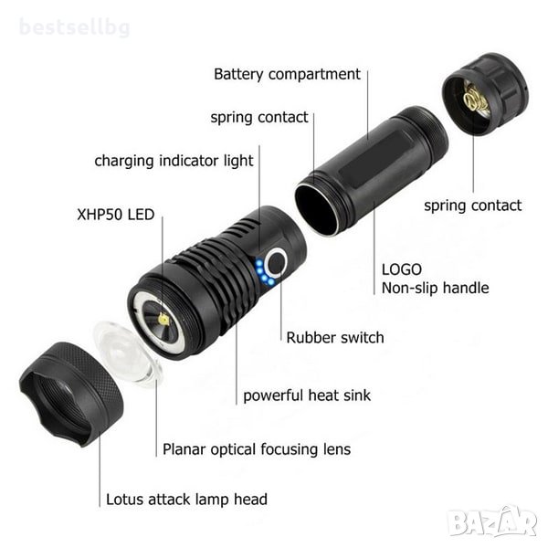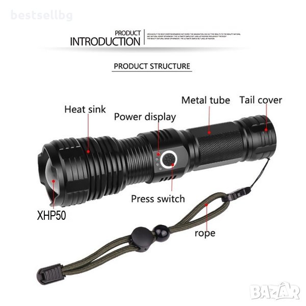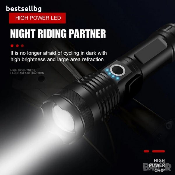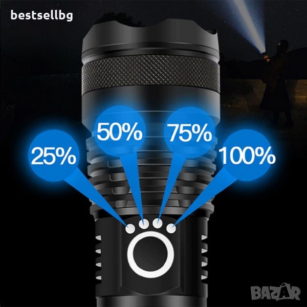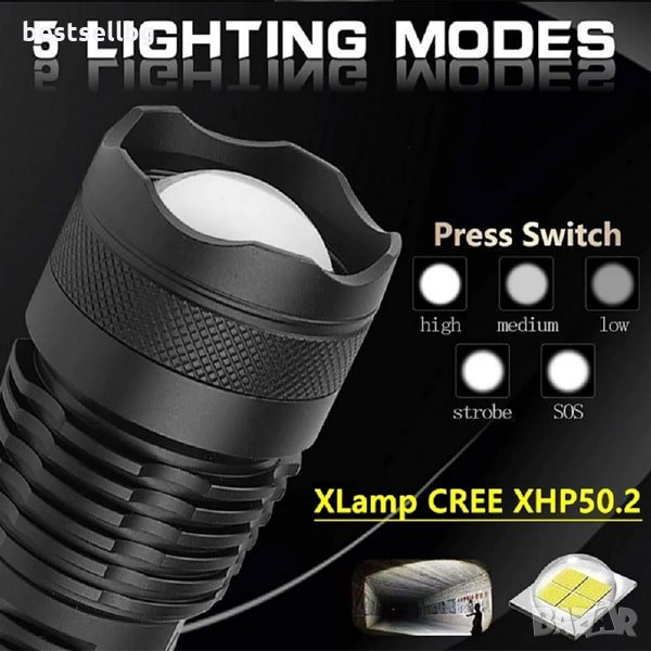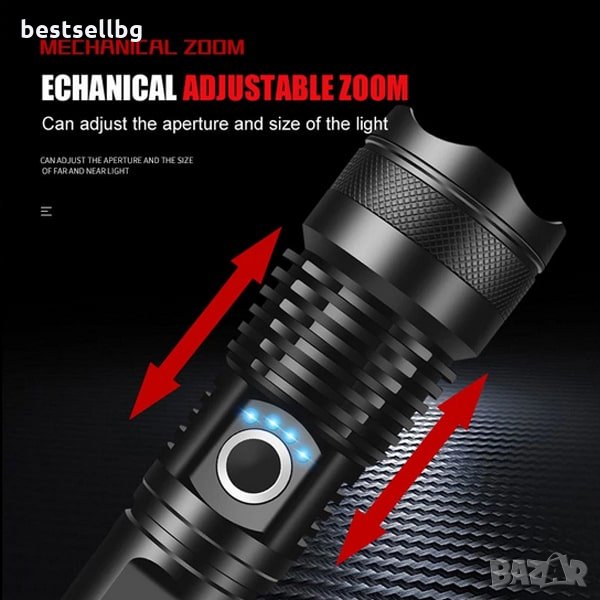 Акумулаторен XHP50 LED тактически фенер с 3000 лумена, 5 режима на светене, индикатор за капацитата на батерията, възможност да работи с няколко модела батерии 18650 или 26650 3.7V Li-ion