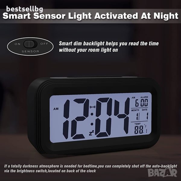 Безжичен цифров часовник, работещ с батерии, Интелигентен сензор, Нощна светлина, Отлагане на датата Температура 12/24 часа