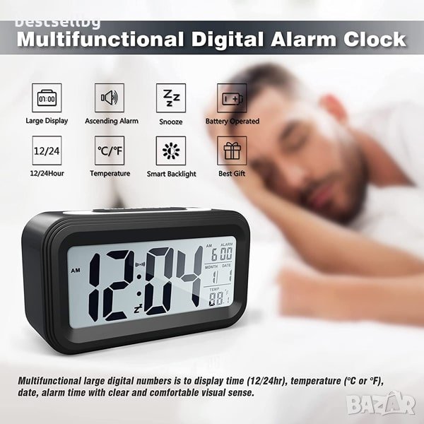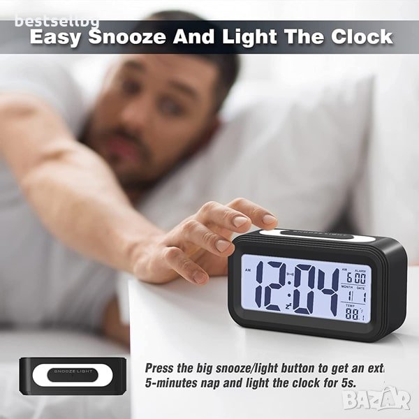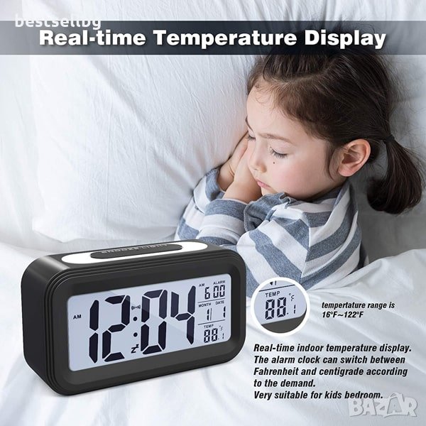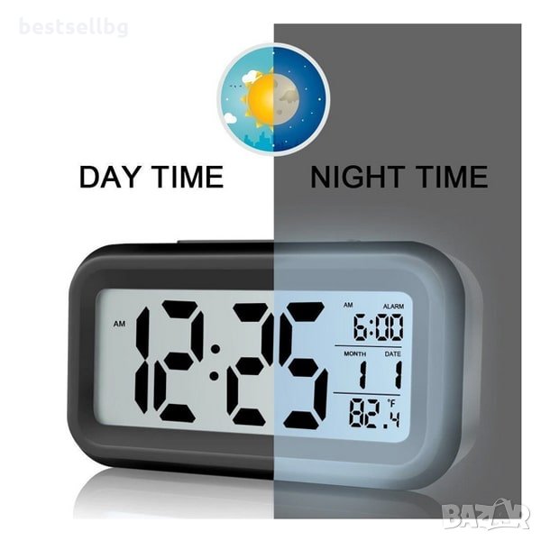 Цифров часовник със сензор за нощна светлина показване на час 12/24 часа, температура °C или °F, дата и час на алармата.