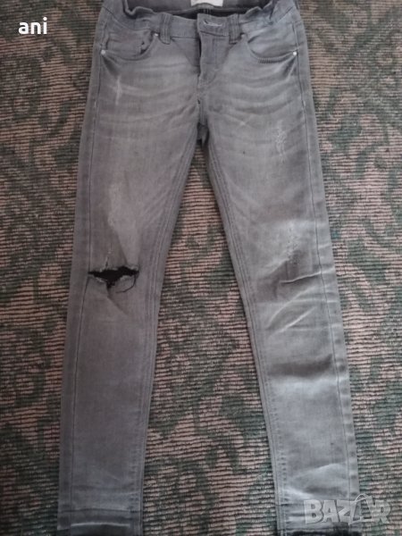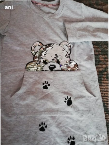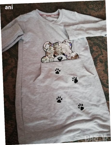 Комплект в сив цвят, туниката не е обличана, с джобчета, 🐾 и мече с обръщащи се пайети, памук. Слим дънки със скъсано, в талията с ластици за регулация, в много добро състояние са+къса блестяща блуза с лека вата, отлична!
