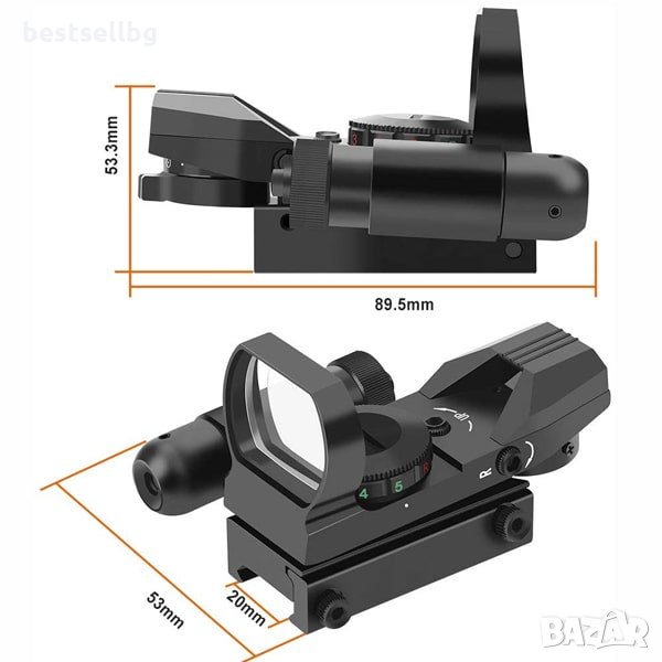 Бързомер 1x22x33 Red and Green Dot Sight с червен лазер, 4 различни вида мерници и 5 различни сили на яркост с размер на шината до 20мм