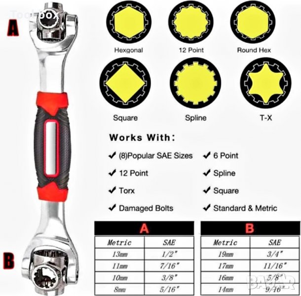 Универсален 48-в-1 гаечен ключ, който незабавно се превръща в правилния инструмент за всяка работа само с едно кликване между различните размери! Универсалният гаечен ключ се променя от един размер на следващия по-бързо, колкото можете да смените обикновенния ключ с друг.