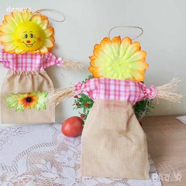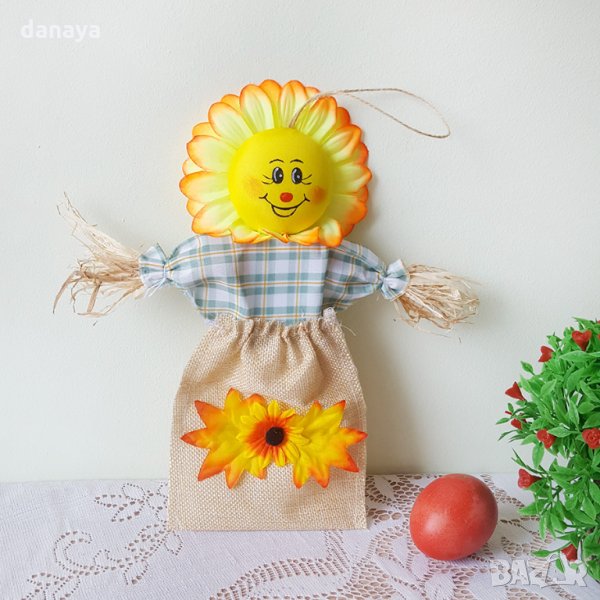 Слънчева украса за закачане на стена или врата, за да украси светлият празник Великден. Слънце с торба, украсена с цветя. Прекрасна декорация за Великден. Фигурата е изработена от текстилни и естествени материали.