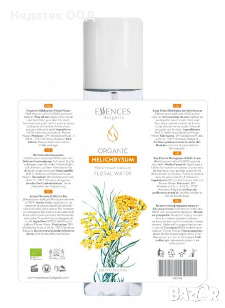 Органичната вода от Безсмъртниче съдържа водоразтворимите етерично-маслени компоненти от растението и оказва почистващо, хидратиращо, антибактериално, ревитализиращо, успокояващо, противовъзпалително, обезболяващо и насърчаващо кръвообращението лечебно действие върху кожата.