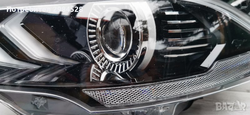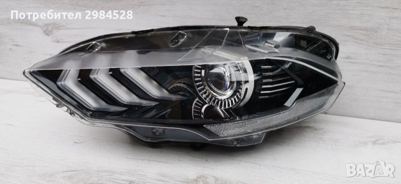 Оригинален ляв фар за Ford Mustang след 2018 година, Full LED, два счупени захвата (горен и долен от към калника) и един здрав (от към предната решетка). Липсва електрическото моторче за реглаж, но то може да се прехвърли от другия фар. Европейски.