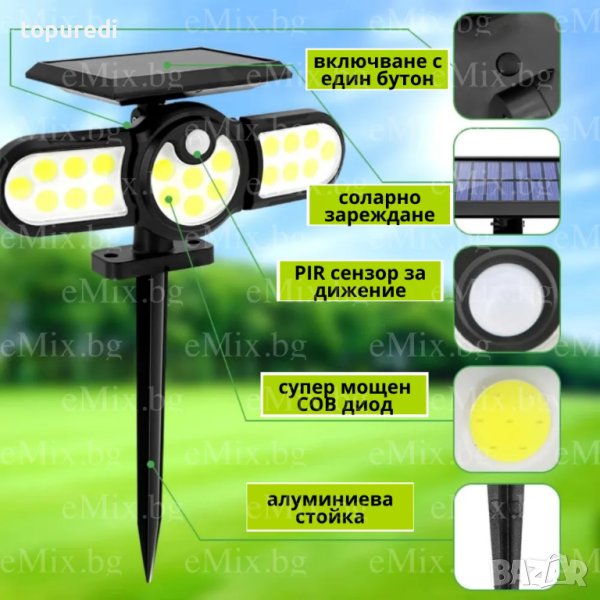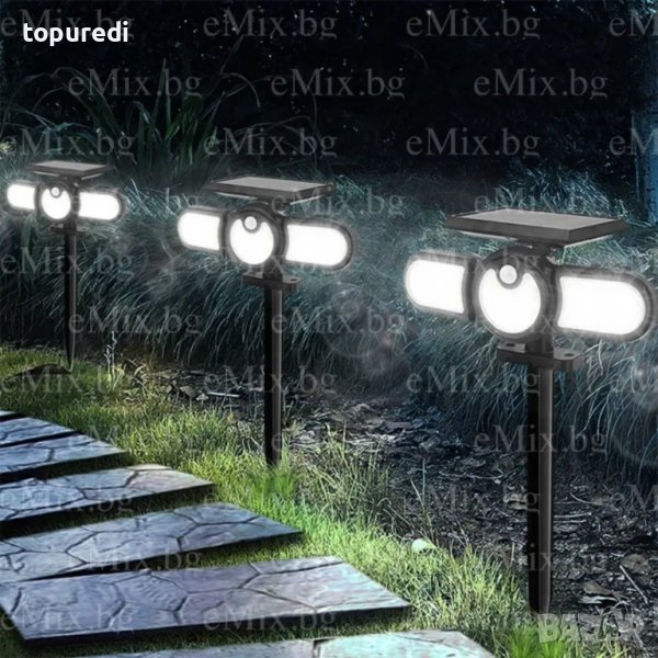 Регулируема лампа със соларен панел и сензор за движение, с помощта на която ще можете да осветите голям периметър. Лампата се презарежда от слънчевата светлина и използва запазената мощност за нощно осветление. С иновативния си дизайн лампата има широко регулируема осветителна зона, благодарение на трите глави, които можете лесно да местите по хоризонтала и вертикала за постигане на широк ъгъл на осветяване до 270°. Соларният панел и лампата са проектирани като едно тяло.