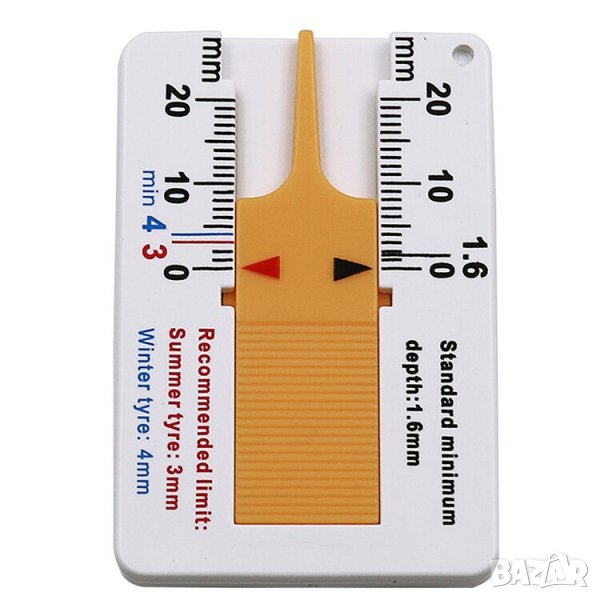 Върху него е отбелязана препоръчителна минимална дълбочина на шарката за зимни (4мм) и летни (3мм) гуми.
