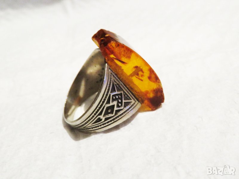 Старинен сребърен пръстен с огромен естествен кехлибар - за успокоение, сила защита и любов