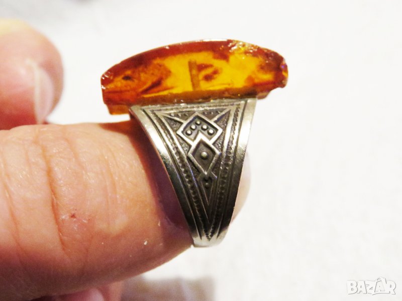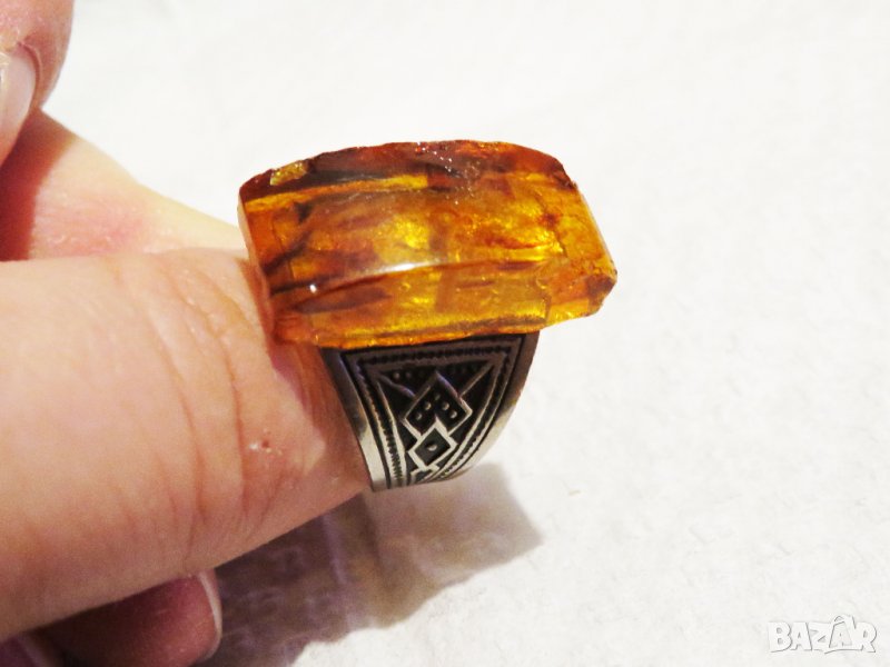 Стар сребърен пръстен с огромен естествен кехлибар - за успокоение, сила защита и любов сребро
