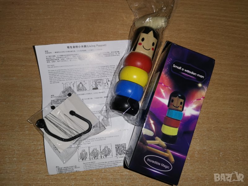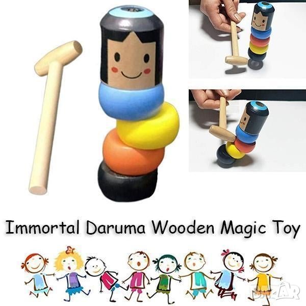 Цветно дървено човече играчка с чукче за правене на магически трикове и игри с него. Има ли дете, та дори и възрастен, който не харесва вълшебствата, магията и фокусите? С тази уникална играчка всички в семейството ще се забавляват искрено. Играчката е съставена от малко дървено човече, чието тяло е направено от четири отделни цветни рингчета и дървено чукче, с което се осъществява магията посредством малка черна магнитна връв.