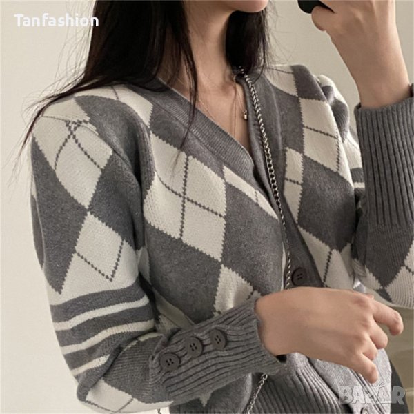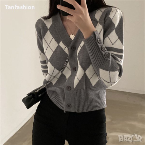 Нова уникална дамска къса жилетка в светлосив цвят на ромбоиди ,в най-актуалните десени за сезона
