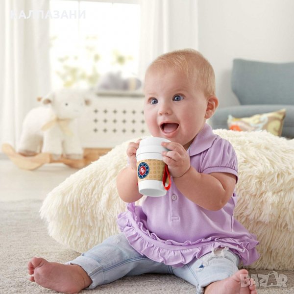 Имитира ли ви вашето бебче докато пиете сутрешното си кафе? Или се опитва да докопа чашата за да я превърне в негова нова играчка? Fisher Price са направили страхотна играчка, с която бебчето ви ще се чувства като истински голям човек. В нея естествено няма никакво кафе, а само забавни цветни топчета. Тя е направена от мек и безопасен материал, във вид на залагалка, която да забавлява малчугана. Диаметърът на чашката е 7 cm, а височината 9 cm.