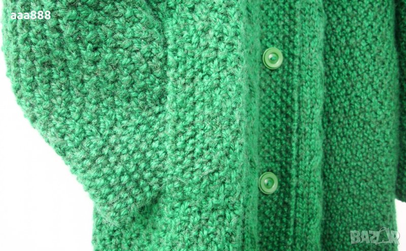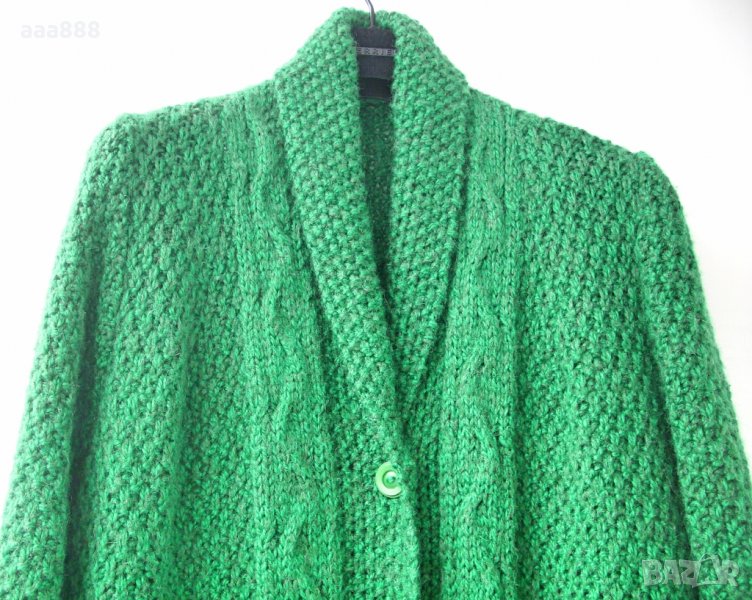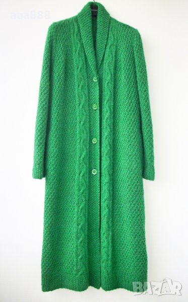 Дамско палто с шал-яка, ръчно плетиво на две куки. Подходящо за есен, зима и пролет. Материал: 100% българска вълна в цвят тъмно зелено и тъмно сиво.Тегло 1.500 кг. Декорирано с широки релефни банери по дължината, които визуално удължават силуета. Два отвора за ръцете, имитиращи скрити джобове отпред. Закопчаване с 4 копчета. Кройката е елегантна, много леко разкроена. На раменете може да се прикачат подплънки при необходимост. Палтото е подходящо за стройни и високи дами, но стои отлично и на по-пълни фигури.