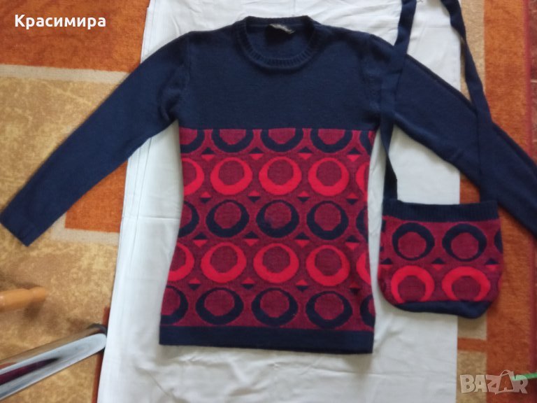 Страхотен дамски пуловер М/Л размер. В комплект с чанта. Пуловера е обличан няколко пъти, чантата е нова.