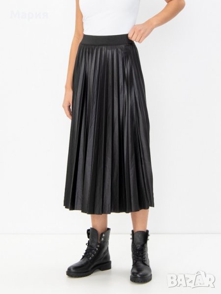 Плисирана пола с дължина под коляното, изработена от тъкана материя с лек блясък. С висока талия с ластик в класическо черно. Без подплата. Налични размери - XS, S, M, L, XL.