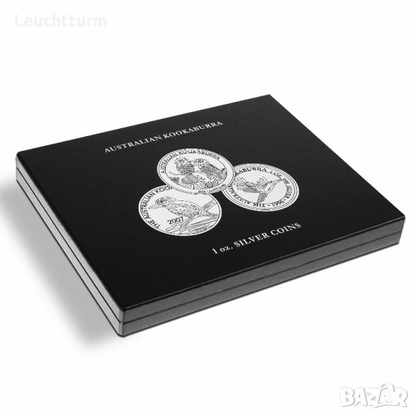 Елегантна черна презентационна кутия за 20 броя сребърни Kookaburra монети (1 oz. издание) в оригинал капсули.