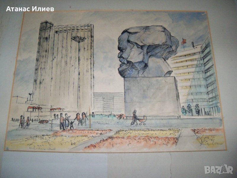 Момументът на Карл Маркс в град Кемниц, Германия. Соц изкуство, картината е подписана, но не знам кой е автора. Размери с паспартуто 61х48 см.