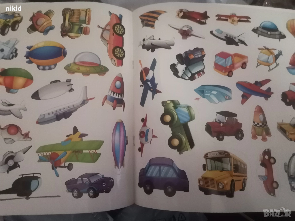 ЗАНИМАТЕЛНА КНИЖКА ЗА ОЦВЕТЯВАНЕ С 12 КАРТИНКИ И 50 СТИКЕРА стикери лепенки самозалепващи Автомобил