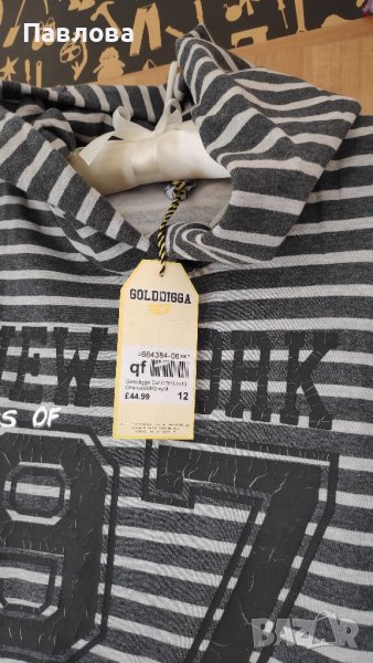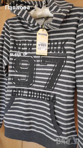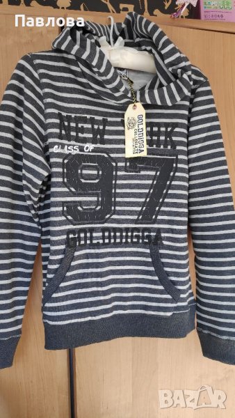 Оригинален суитчер с подплата пролет ен, много ефектен и топъл. Качулка, не се се сменя, надпис и джобчета. Закупен от Англия. 12.