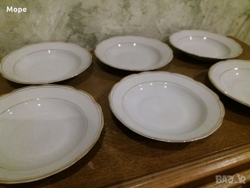 Шест броя порцеланови чиний, дълбоки с диаметър 21.5 см. Без забележки . С позлата и надпис на Изида България .