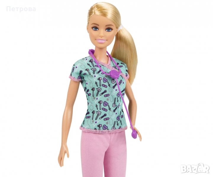 Опознайте света на медицинските сестри с куклата Barbie® медицинска сестра! Когато едно момиче играе с Barbie®, тя си представя всичко, в което може да се превърне, и ако обичате да се грижете за хората и да им помагате, значи може да бъдете медицинска сестра! Куклата Barbie® медицинска сестра (30,40 cm) е облечена с медицинска униформа, която се състои от горна дреха на принт с медицински принадлежности и розови панталони, бели обувки и хваната в небрежна опашка коса. Куклата се предлага със стетоскоп, който виси на врата й. Децата ще се влюбят в безкрайните възможности за игри, изпълнени с креативност и забавление.