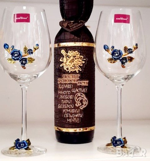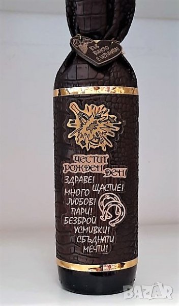 Бутилка апликирана с кожа и стилно пожелание за съответния юбилей - 40, 50, 60, 70 или 80 години или за рожден ден.