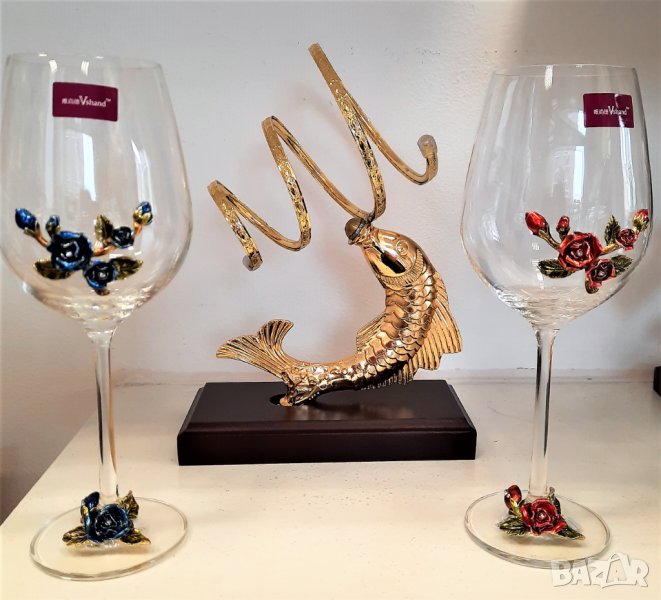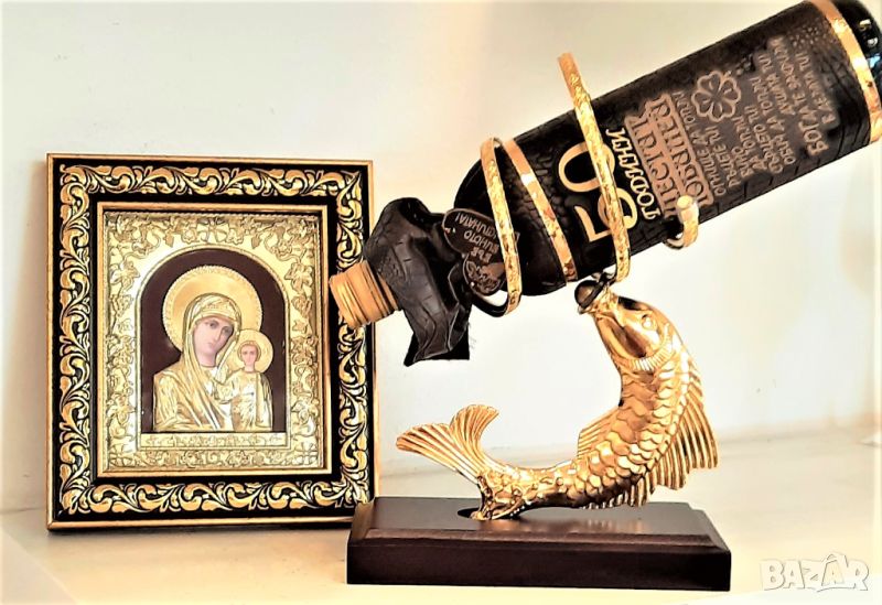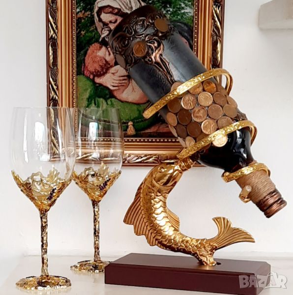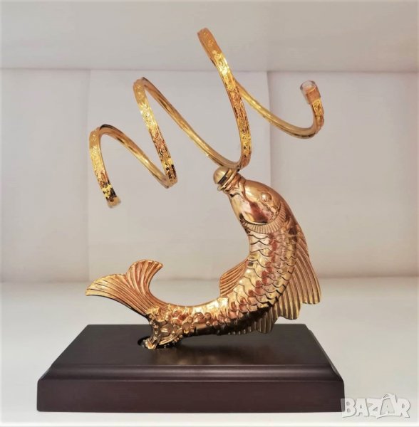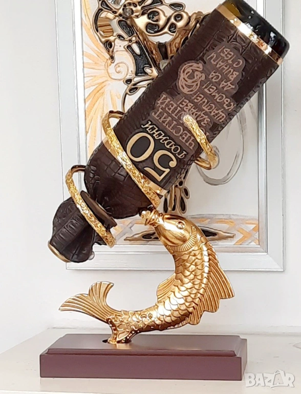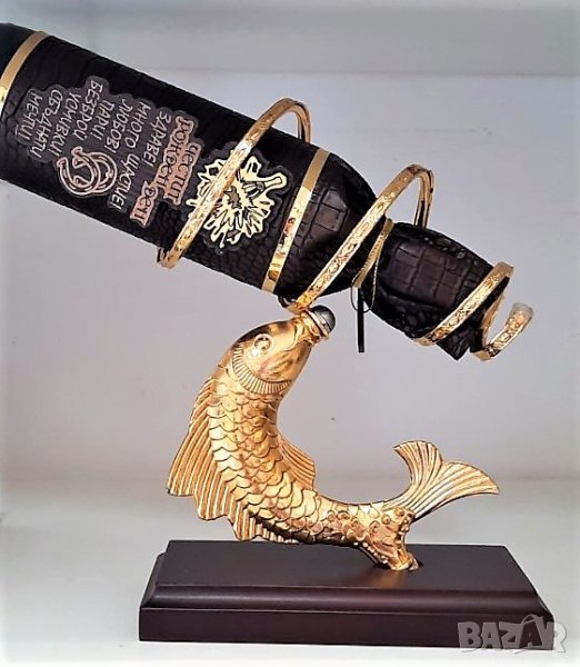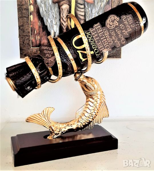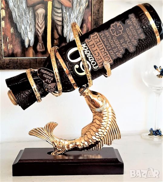 Оригинална, златна поставка за бутилки Риба изработена от месинг и махагон .