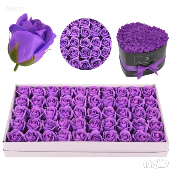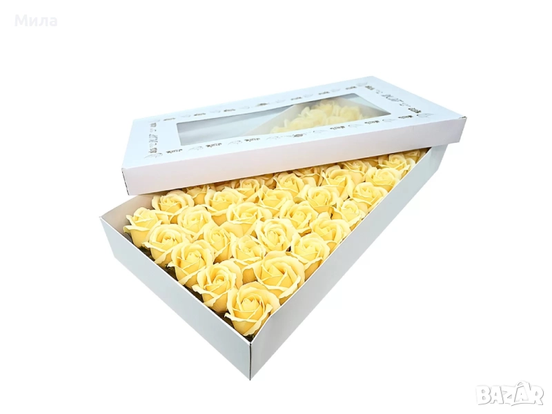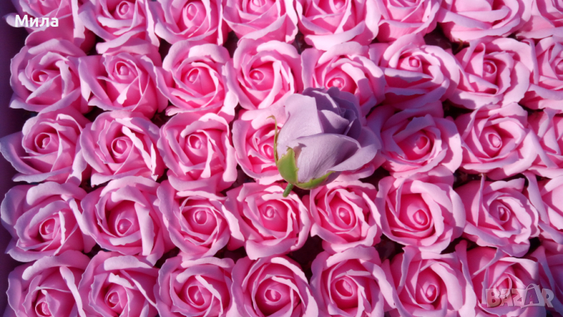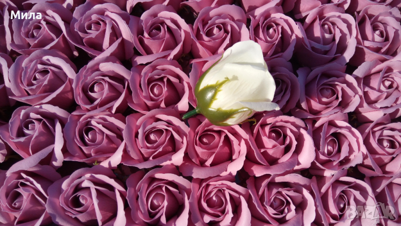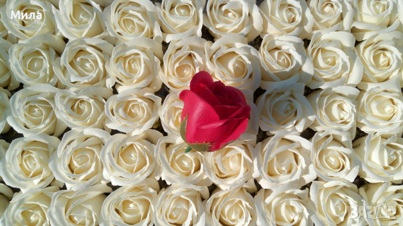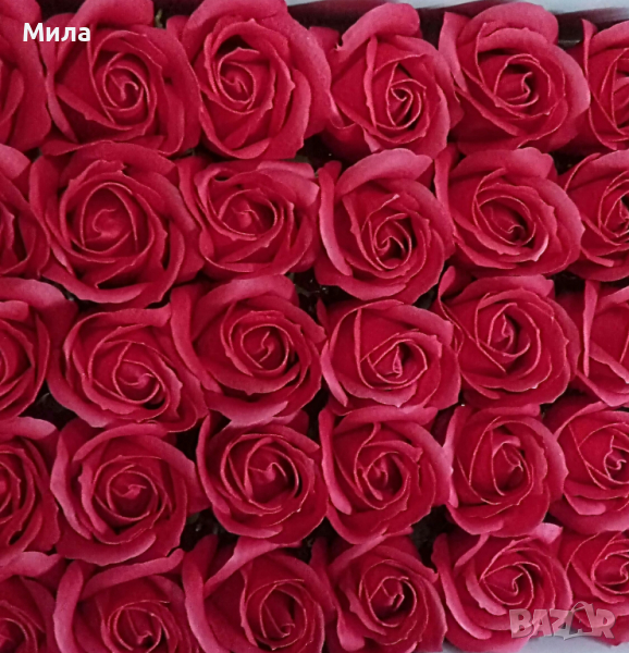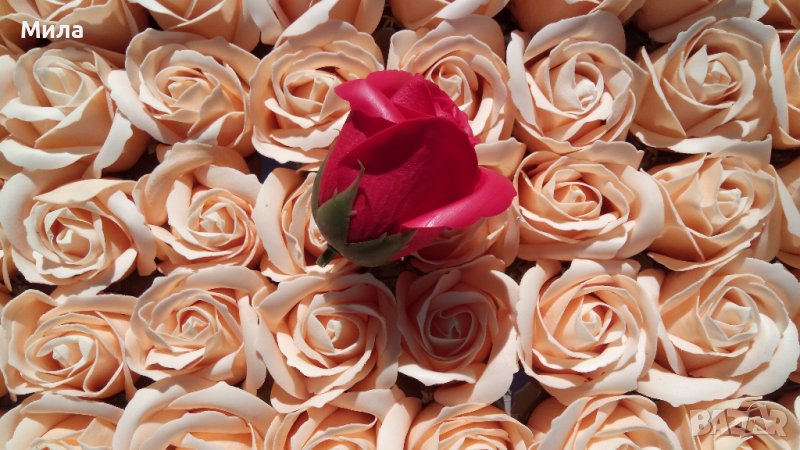 Сапунени рози, размер 6/5 см. Цена на единична бройка - 0.60 лв. Цена на кутия рози от 50 броя - 25 лв. Микс по ваш избор. Налични цветове към момента : Бяло, екрю, лилаво, розова праскова, бебешкорозово, тъмнорозово, пепел от рози, карамел, червено, бордо. Всички налични стоки от тази категория можете да разгледате на фейсбук страницата ни "Фантазе- материали за ръчна изработка" в албума "Цветя, плодчета, мъх" или на нашия уебсайт artmateriali.bg