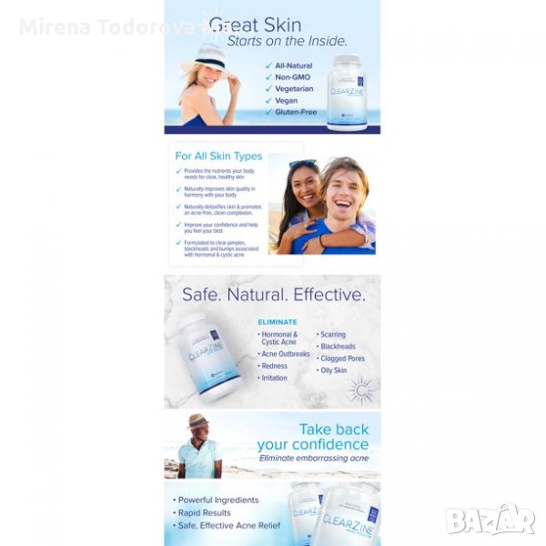 ClearZine е единствената добавка, която е пълноценно лечение на акне, предотвратявайки огнища на акне и подобрявайки качеството на кожата, естествено и в хармония с тялото ви без суровите, опасни химикали, които могат да лишат кожата от необходимите хранителни вещества. Страничните ефекти включват красива, чиста и гладка кожа, повишена увереност и подобрена представа за себе си. Нашите лоялни клиенти са видели резултати само за две седмици, с увеличаване на резултатите с времето.