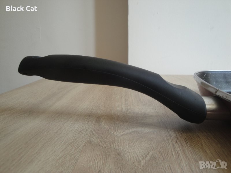 Състояние: Тиганът е използван, но е в запазено общо състояние. Единствената забележка е лекото обелване на част от покритието в средата на съда (показано е най-вече на последните две снимки).