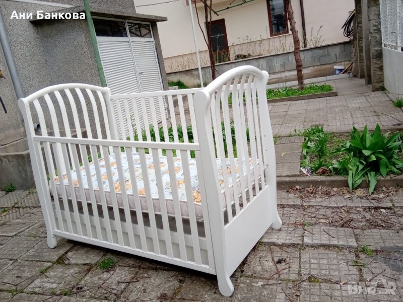 Дървено бебешко креватче. Има две нива и опция люлка. Цвят бял.