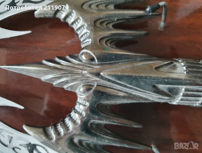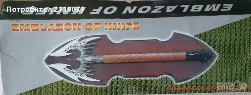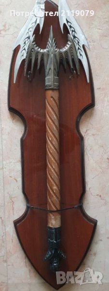 Сувенир от стомана за стена с дървена дръжка. Дължина 70см, а на дървената поставка 75см.