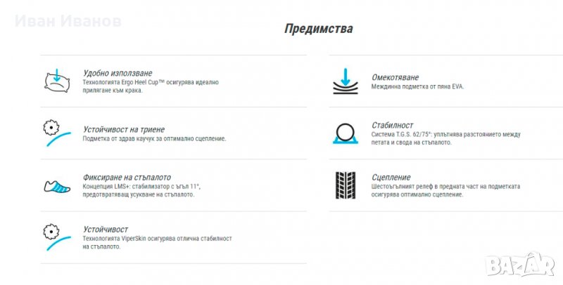 Бърза вътрешна обувка с гъвкава горна част, която осигурява добра опора за бързи завои. Външната подметка е покрита с гума за добро сцепление. Разлика между нивото и петата: 6 мм.