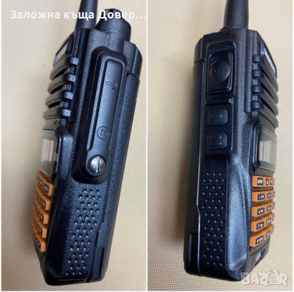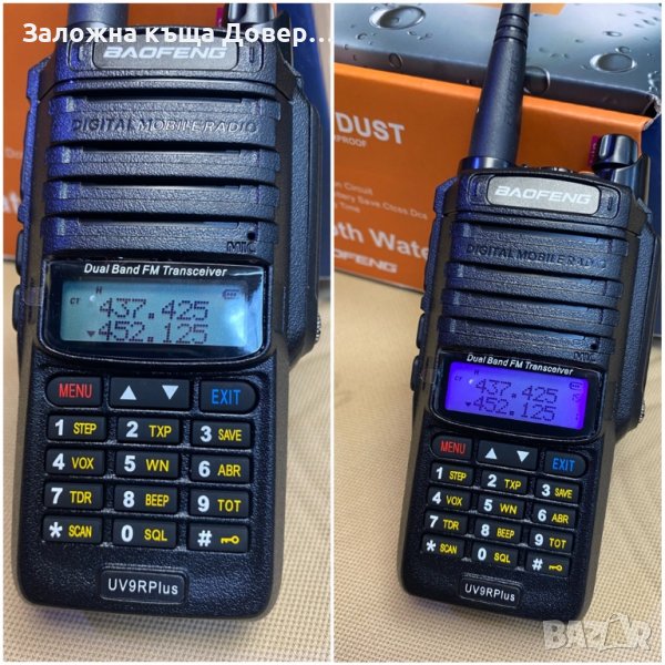 Baofeng баофенг uv9-R 20W 9800 mah 13wh батерия Последна версия! Най-мощните с най-голяма батерия на пазара!! Чисто нови пълен комплект.Двубандова станция влаго и прахоустойчива.Мощност 15W,най-новата и най-мощната радиостанция baofeng.Изключително подходяща за лов,излети,планинари,охрана,пара и делта планеристи.Към радиостанцията има зарядно,много издържлива мощна батерия li-ion 9800 mah 13,3 wh 7,4v,клипс за закачане на колан и въже за китка.Станцията има укв радио с обхват 88-108 mhz за слушане,двубандова гумирана антена,Led фенер.